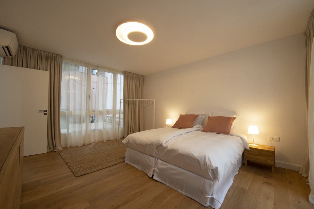 Donnant sur le patio et sur la terrasse, elle est équipée d’une grande commode et d’un portant à vêtements.