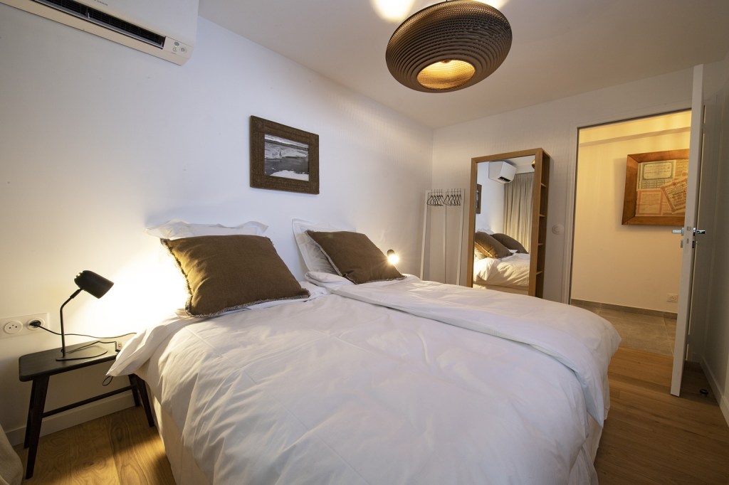 Avec son meuble de rangement avec penderie en chêne et son plafonnier doré, elle donne sur le calme du patio.