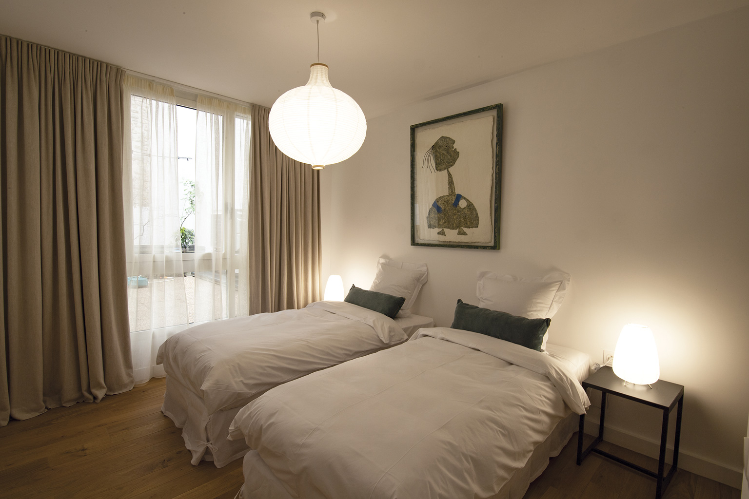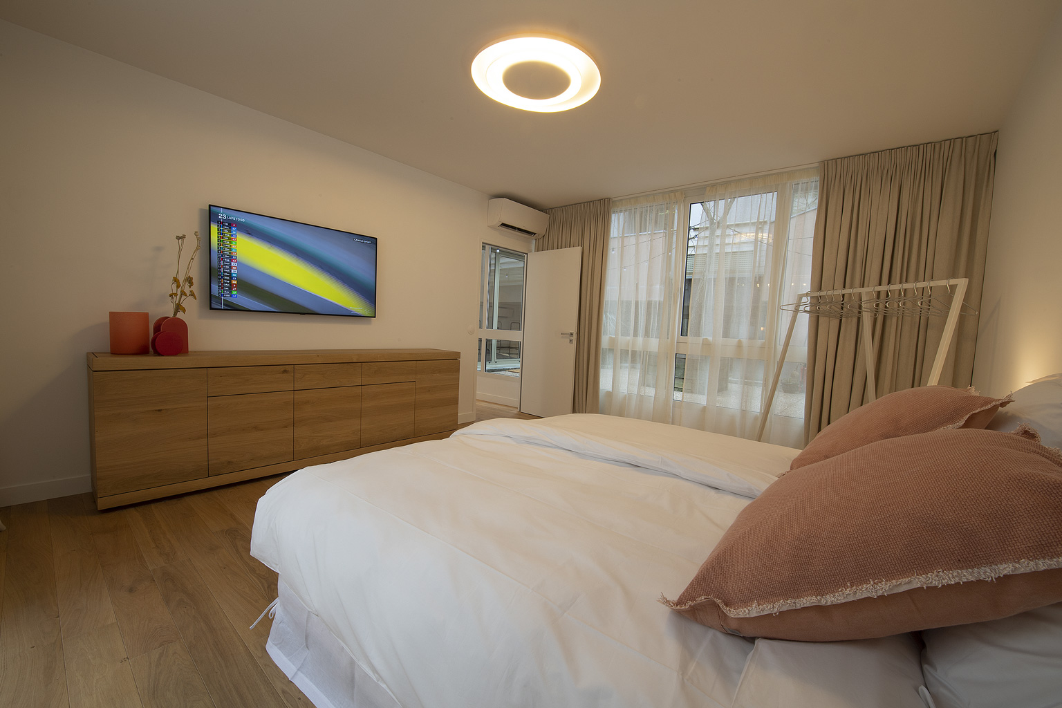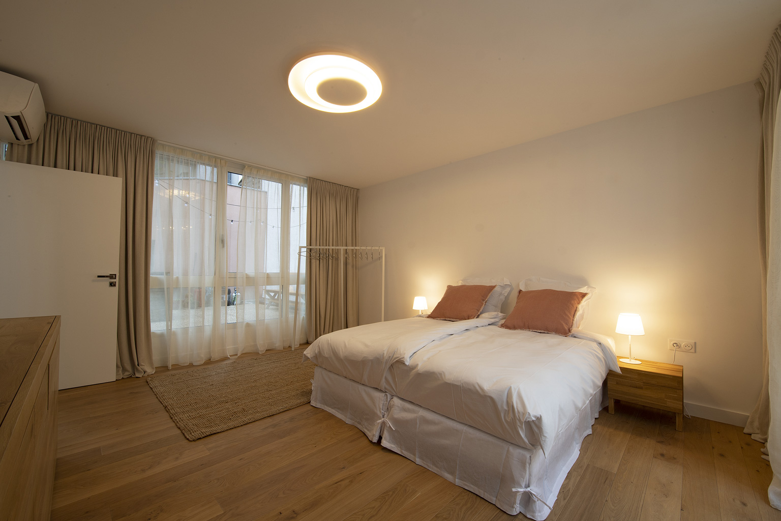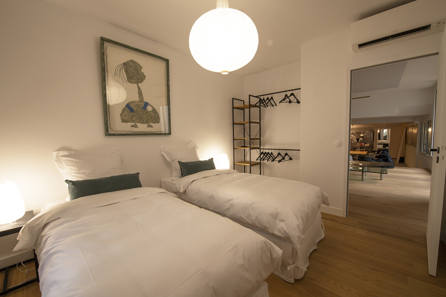 Juste à côté de la chambre 1, dans la première partie de l’appartement, elle donne elle aussi sur le patio. Avec son lustre design en carton ondulé elle offre une ambiance chaude. Un portant et une étagère en chêne avec un grand miroir, deux paniers pour mettre lingerie ou accessoires vous permettront d’installer vos affaires. 10m2