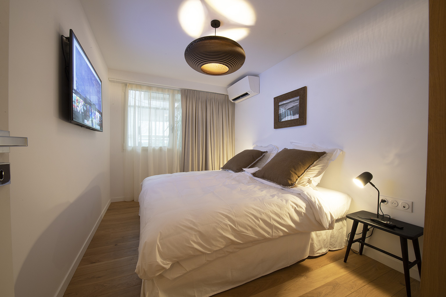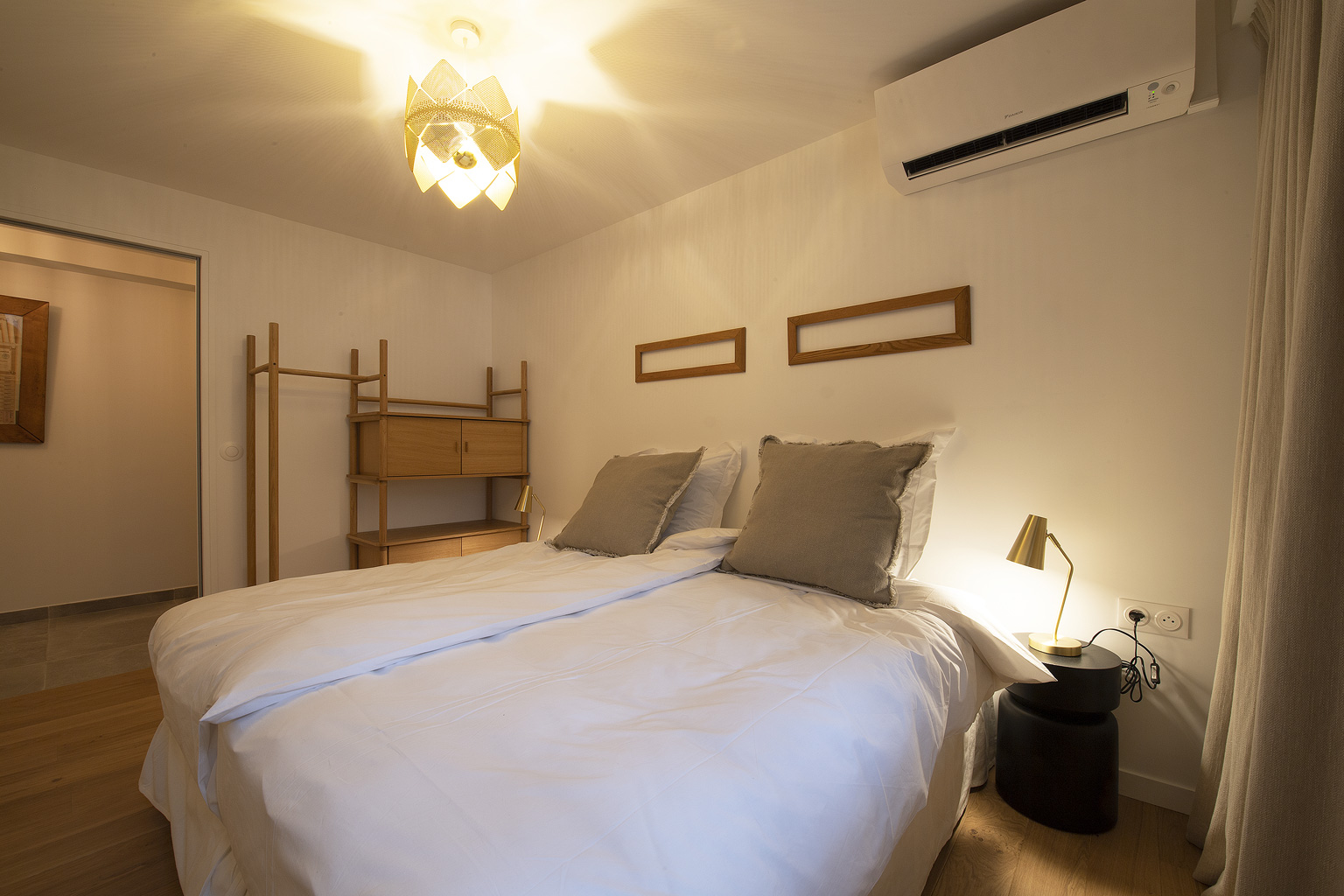 Elle se situe dans la première partie de l’appartement et donne sur le patio. Elle est équipée d’un meuble en chêne massif avec une partie portant, deux étagères et deux petits placards. Un lustre et des lampes de chevet dorés lui donnent une ambiance contemporaine chic. 10m2